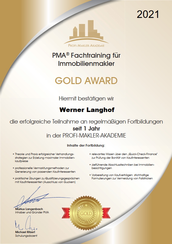 Der Immobilienmarkt, das Mietrecht, Gesetze und Verordnungen rund um Immobilien ändern sich ständig. Nur die stetige Weiterbildung eines Maklers sichert die grundlegende Kompetenz für eine TOP-Beratungsqualität. Deshalb nehme ich seit Jahrzehnten regelmäßig an Fachseminaren, Weiterbildungs-Seminaren und Lehrgängen teil, um immer auf den aktuellen Stand zu sein und um fachkundige sowie zuverlässige Beratungen bieten zu können.